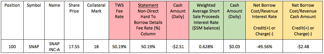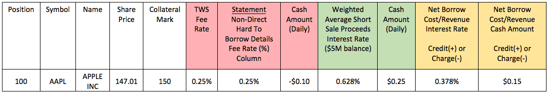 Беря в расчет средневзвешенный процент в 0,628% по выручке от коротких продаж при балансе в USD 5 000 000 (схоже с AAPL в примере выше), чистая стоимость/выгода займа составляет -49,56% или дебет в 2,48 USD в день.