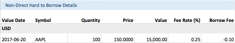 TWS отображает следующие данные для AAPL. Столбец "Ставка отчисления"* отражает плату за заем, которая будет снята со счета и указана в выписке.