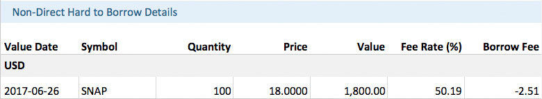 • Стоимость заимствования акций с особыми ограничениями (например, инструменты, заимствование которых считается затруднительным) обычно выше, чем для обычных акций. Данные дополнительные затраты будут учтены в виде более низких кредитных начислений за шортинг акций. Обратите внимание, что это может привести к чистому дебетовому остатку по кредитным начислениям за шортинг акций, если стоимость заимствования превысит полученные проценты. Для просмотра ориентировочных процентных ставок на шортинг определенных акций, IBKR рекомендует клиентам воспользоваться инструментом Доступные для шортинга акции (SLB) на странице "Поддержка" в "Портале клиентов".